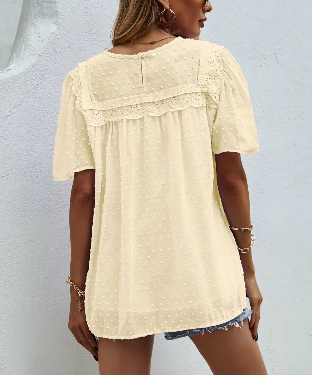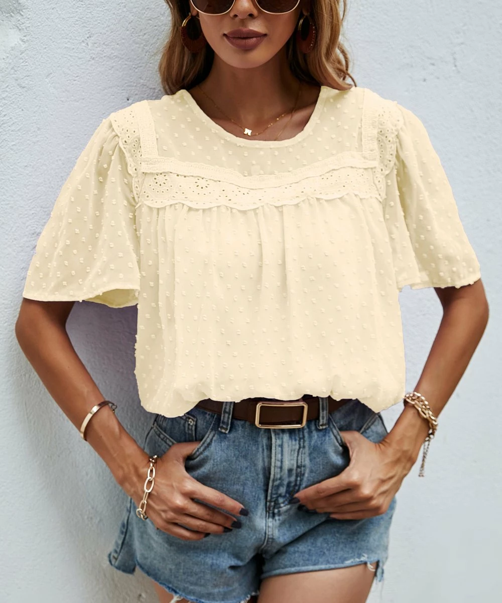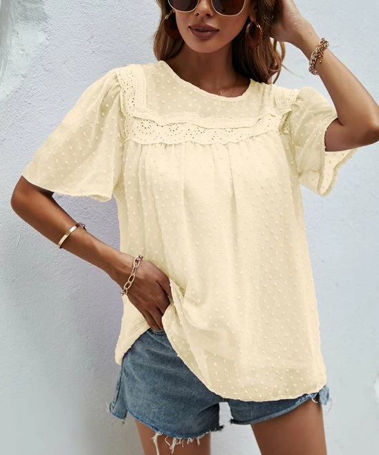 Best Pirce πŸ₯° Camisa Apricot Swiss Dot Lace-Contrast Crewneck Top – πŸ‘© Women 😍