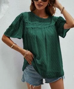 Bring a chic finish to your favorite pair of denim by topping it with this Swiss dot top featuring a neckline framed with lace and flowy bell sleeves.