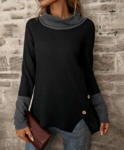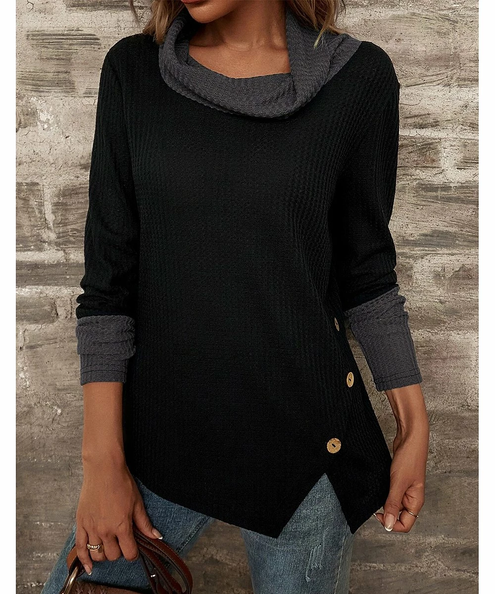 Long-sleeve top with a chic cowl neckline and a button-accent design.