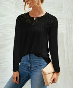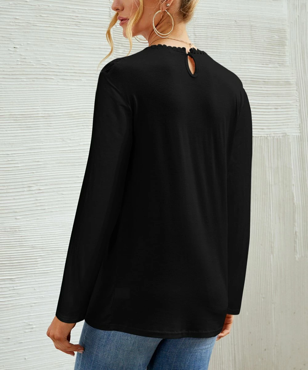 Add a dressy touch to your casual looks with this long-sleeve top that’s accented by a dash of lace.