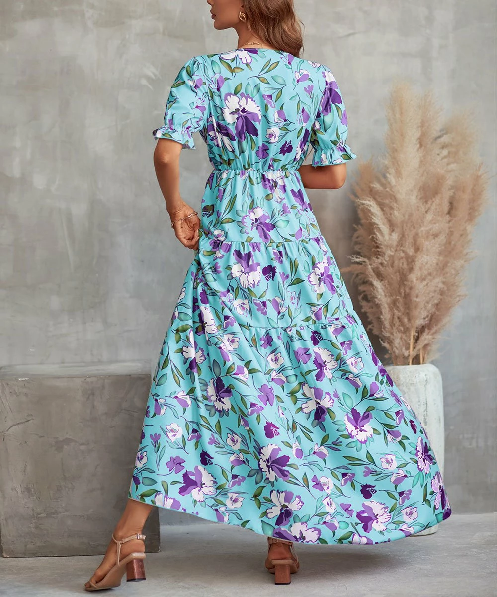 Flowing maxi dress featuring a colorful floral print and plunging v-neckline.