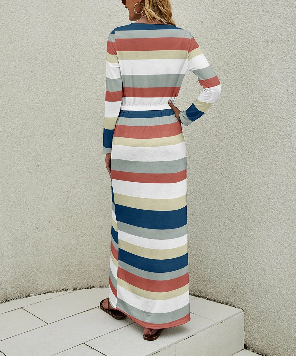 Signal casual comfort when you don this striped maxi dress complete with a tie at the elastic waist and a pair of front pockets.