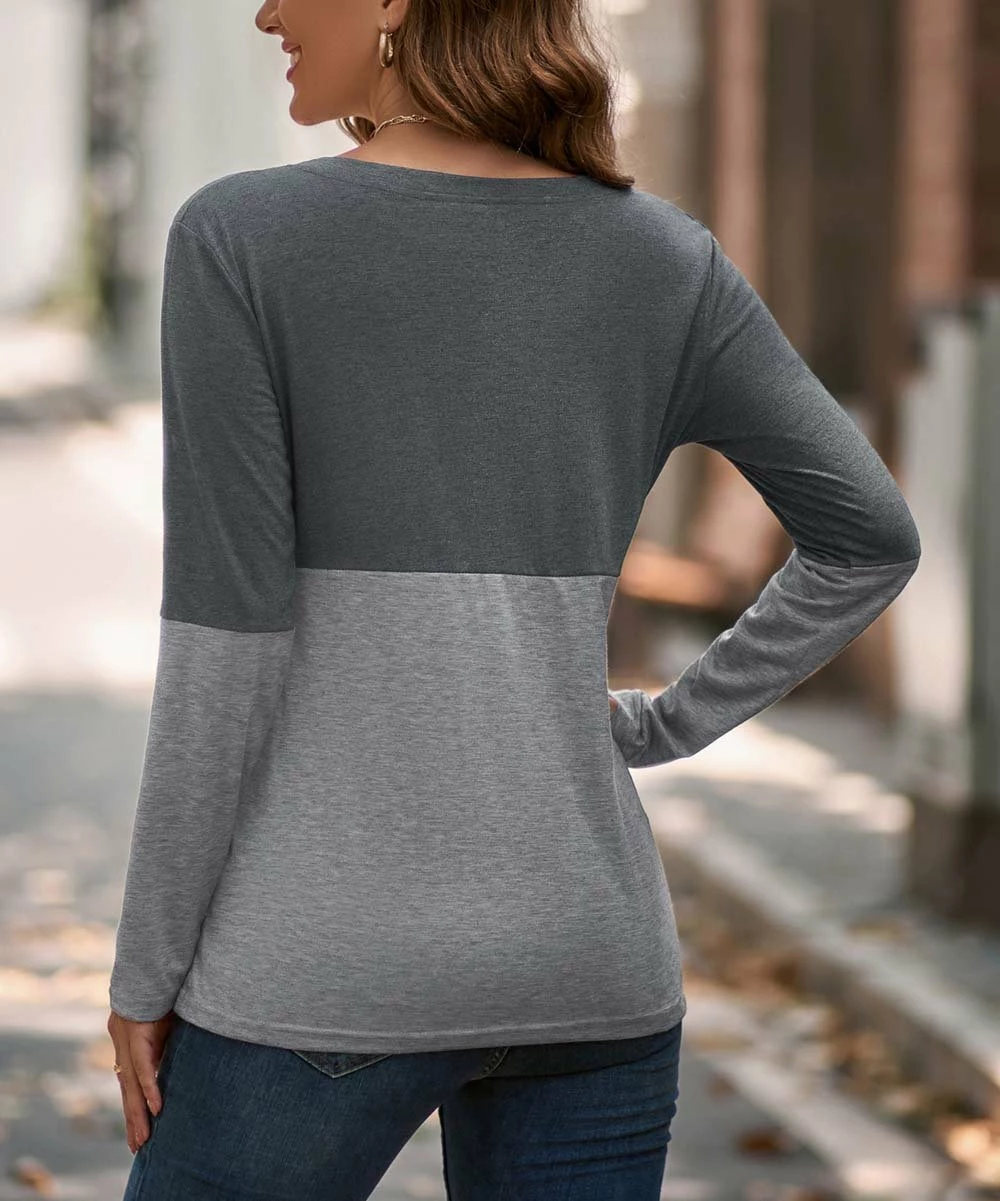 This cotton-blend v-neck top features a long sleeves and a two-tone color block design.