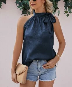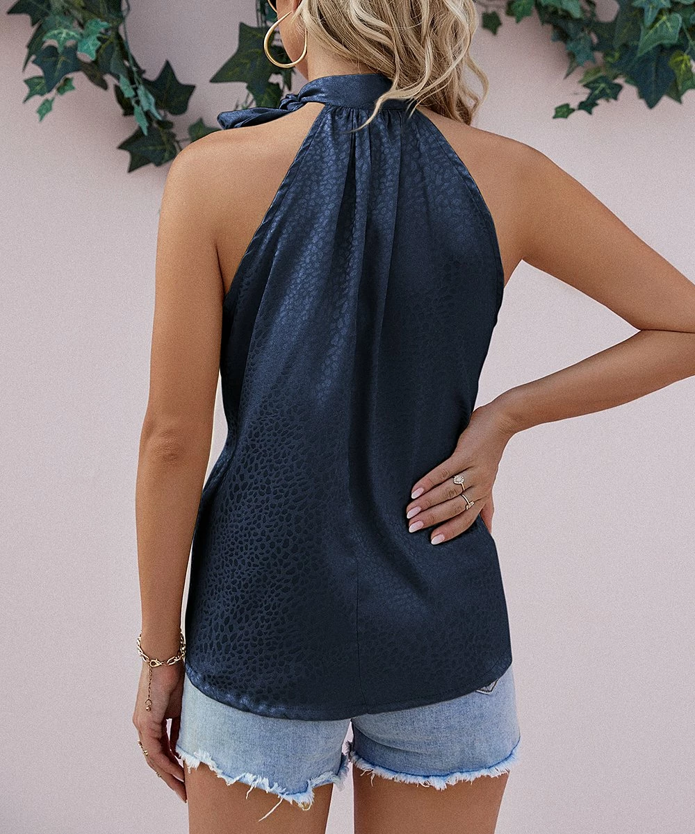 Refresh your closet’s warm-weather basics with this playfully patterned tank boasting a side-tie halterneck design.