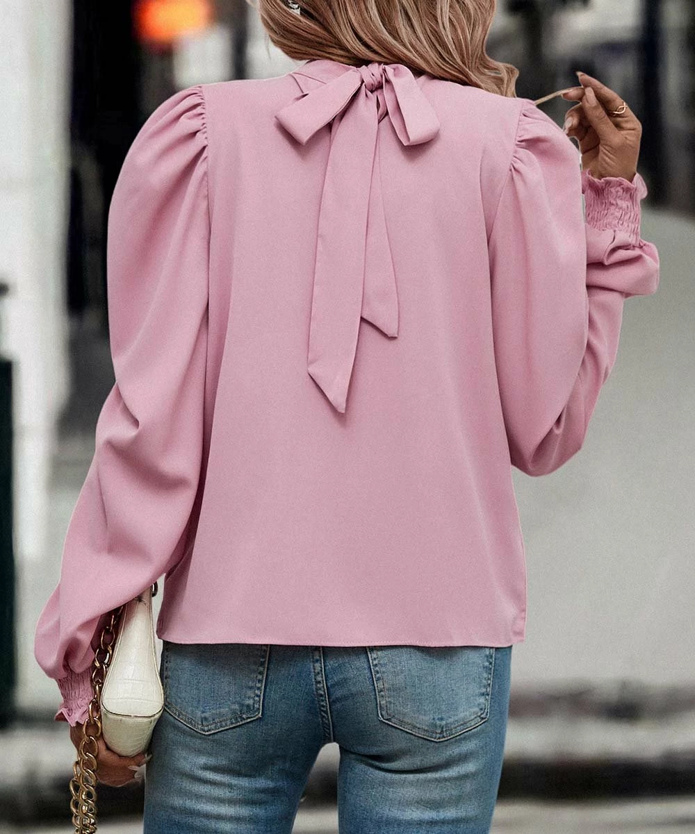 Update your wardrobe with this puff-sleeve top that features a stretch-ready fabric and a dramatic bow in the back for a chic look.