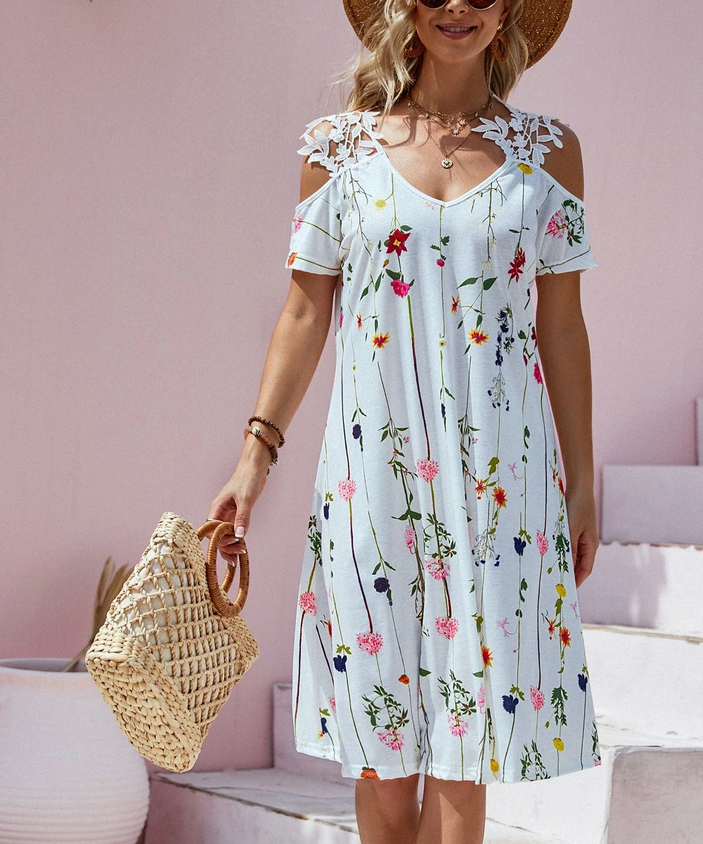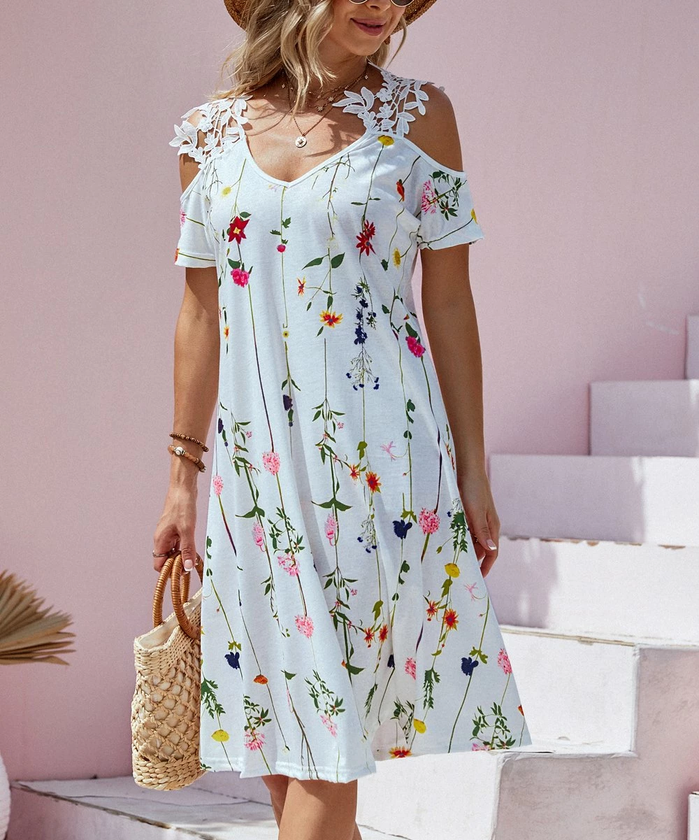 Freshen up your look with the lace-accented cutout shoulder featured on this midi shift dress.