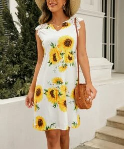 Hot Sale ❀️ Camisa White & Yellow Sunflower Sleeveless Notch Neck πŸ‘— Dress – πŸ‘© Women ✨