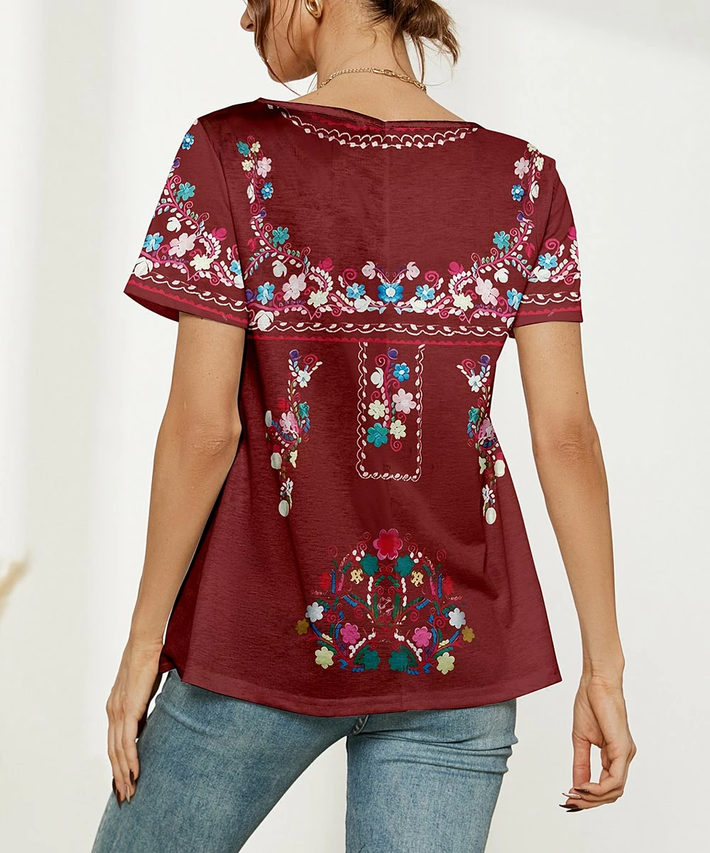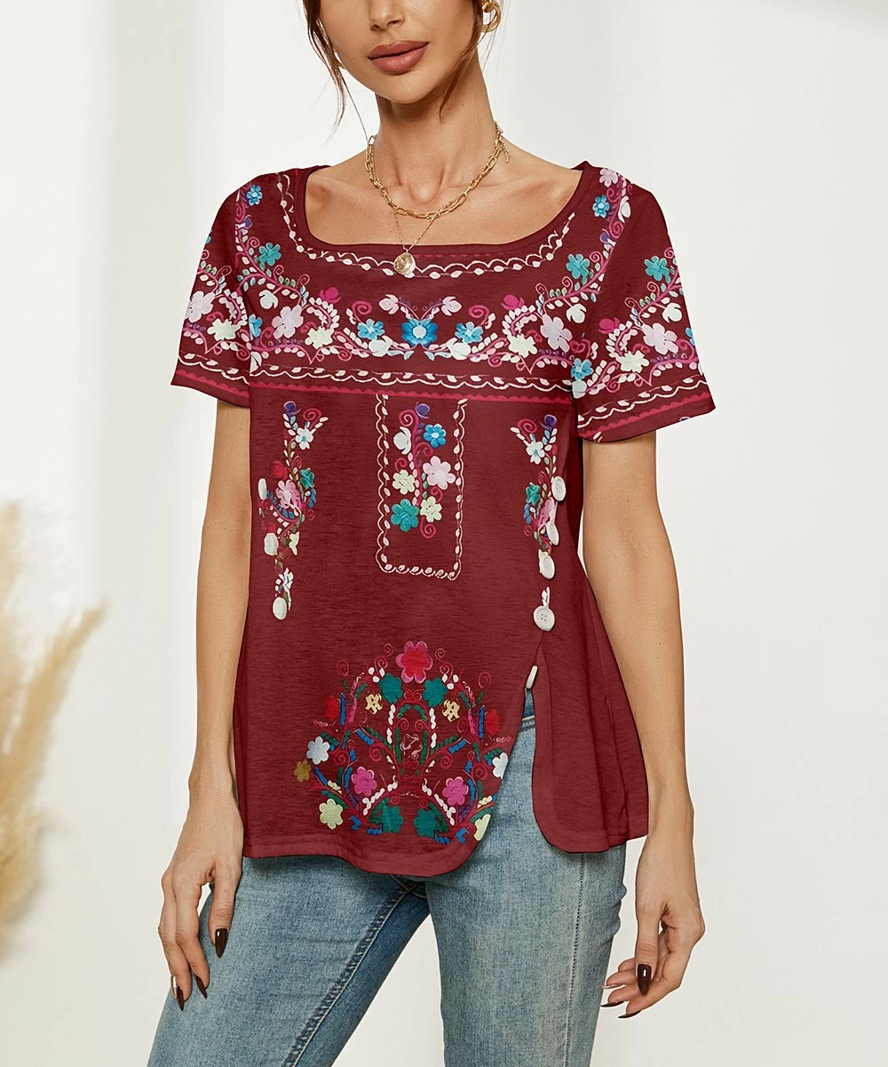 Relaxed short-sleeve top featuring stretch-blend material and button-accented side slits.