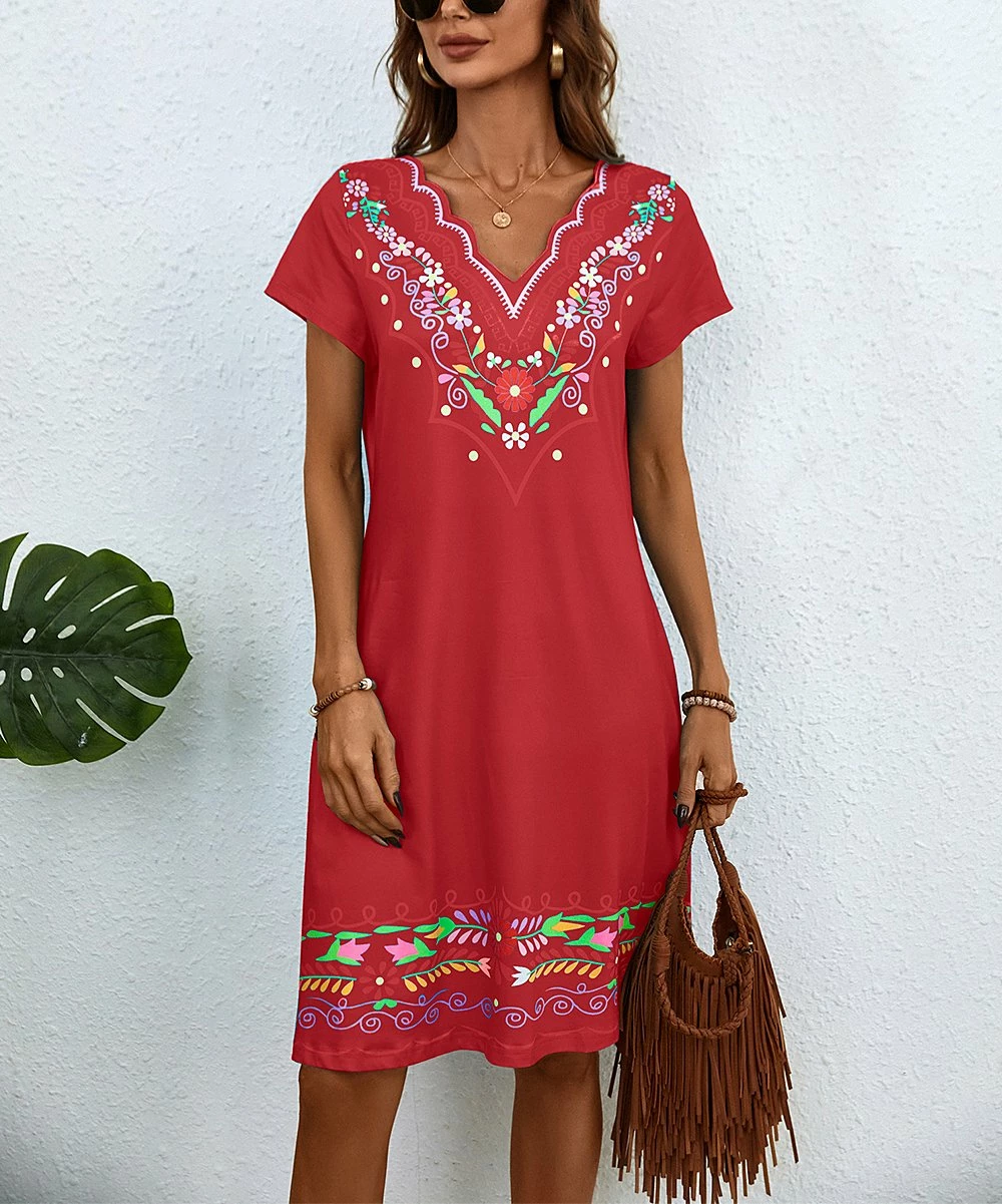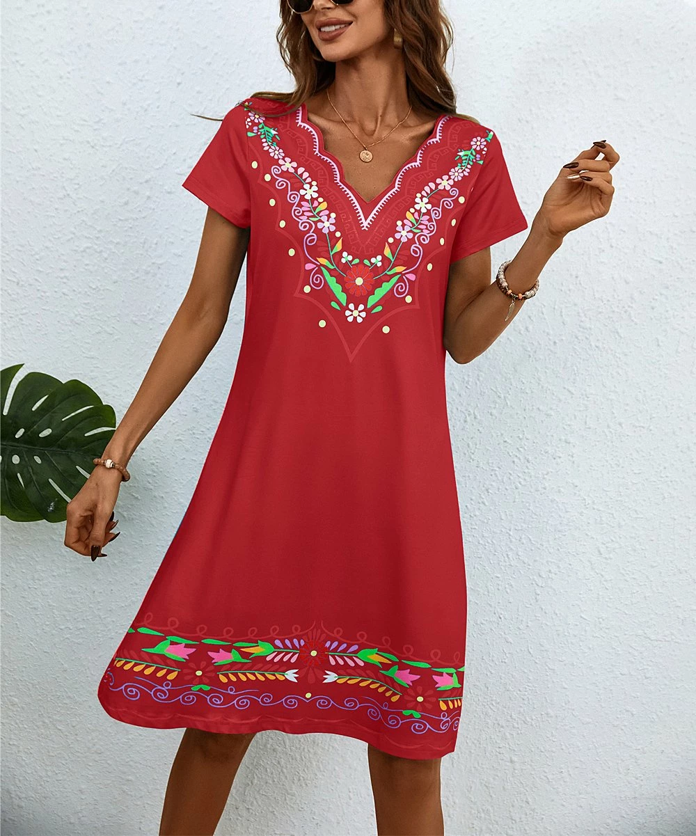 Ease through the day in this relaxed short-sleeve shift dress featuring stretch-infused material and bright patterning along the scalloped neckline and hem.